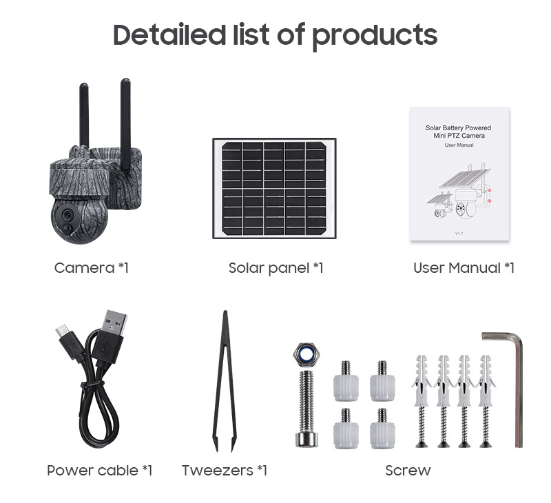 Camera *1Solar panel *1User Manual *1Power cable *1Tweezers *1Screw